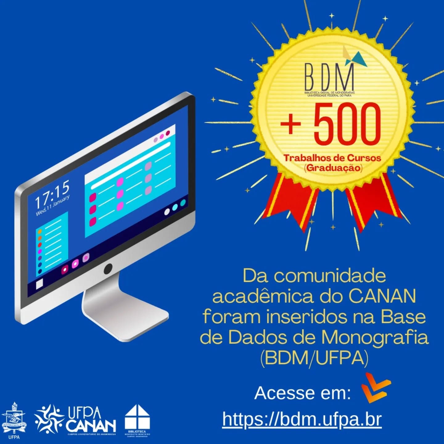 Com satisfação, informamos à comunidade acadêmica que passamos a marca de 500 (quinhentos) Trabalhos de Curso (TC's) inseridos na Base de Dados de Monografia(BDM) da UFPA.
